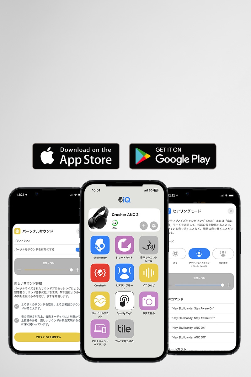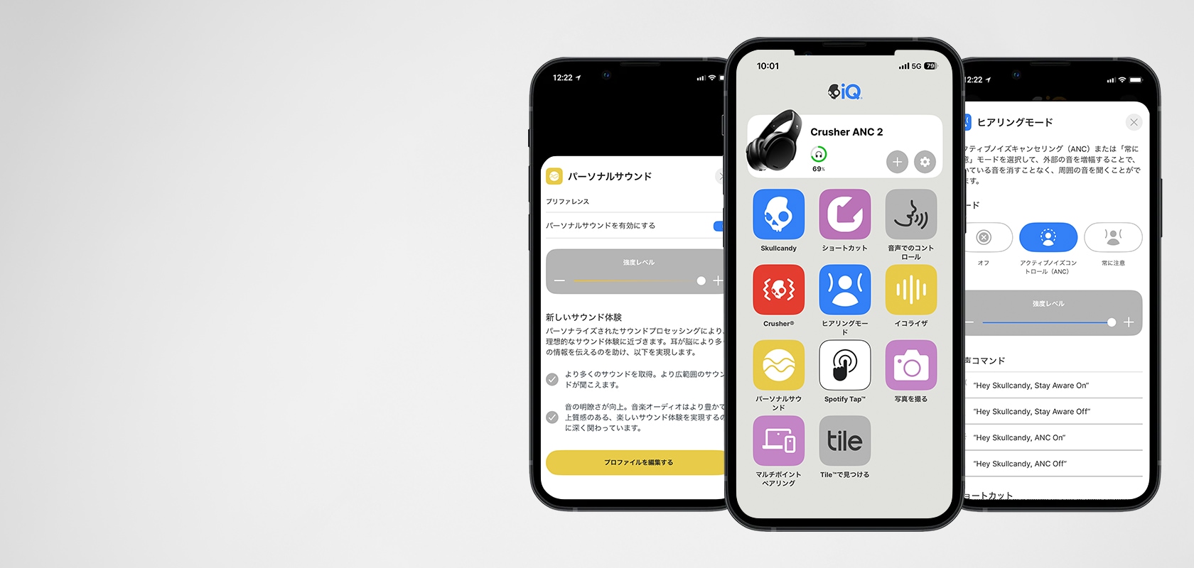 Mimiのパーソナルサウンドはあなた専用の理想的なサウンドへ補正します。Skull-iQアプリ内のパーソナルサウンドにてあなたの聴力を測定し、あなた専用の音質へと改善することで聞き取りづらかった音や今まで聞こえていなが聞こえるようなり新次元の音楽体験を味わえます。アプリ内での測定結果に基づきサウンドプロファイルが作成されヘッドホンへ直接保存されます。