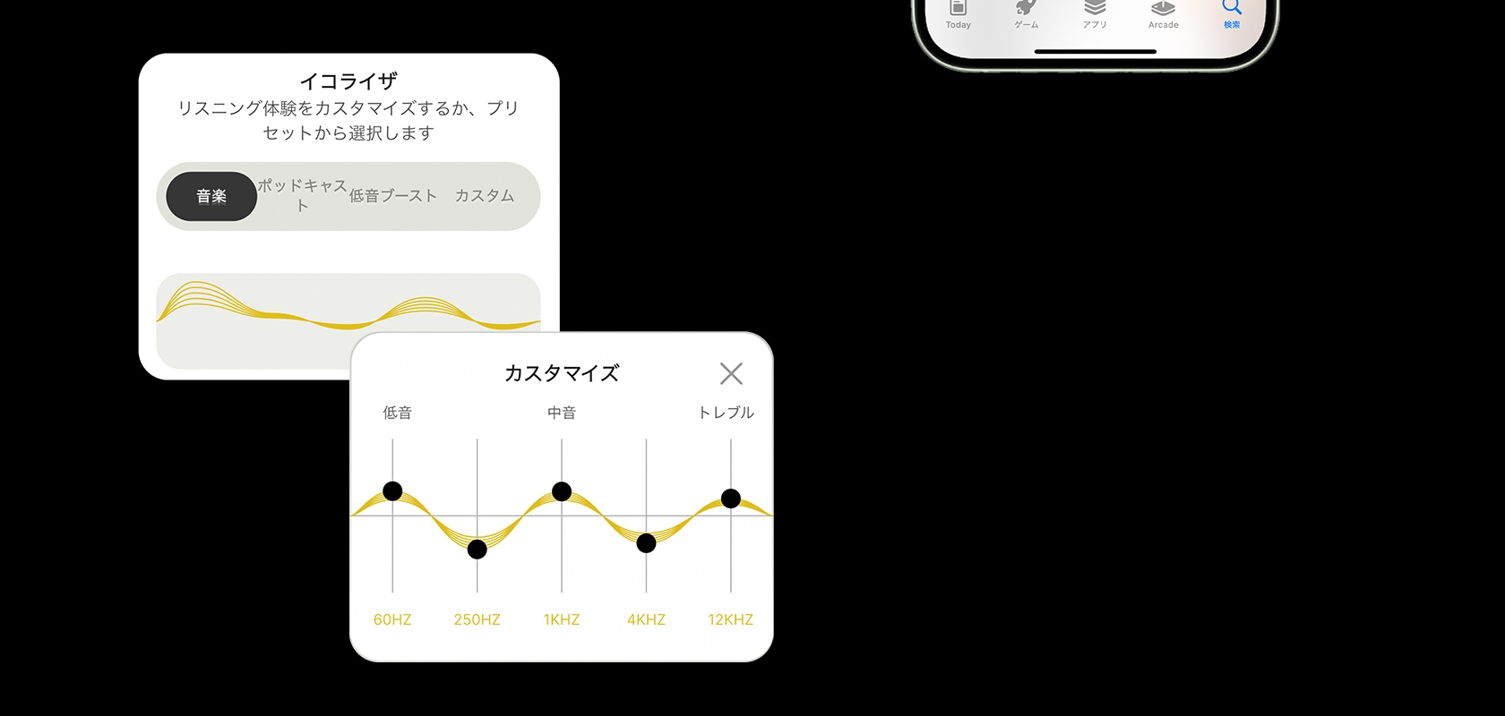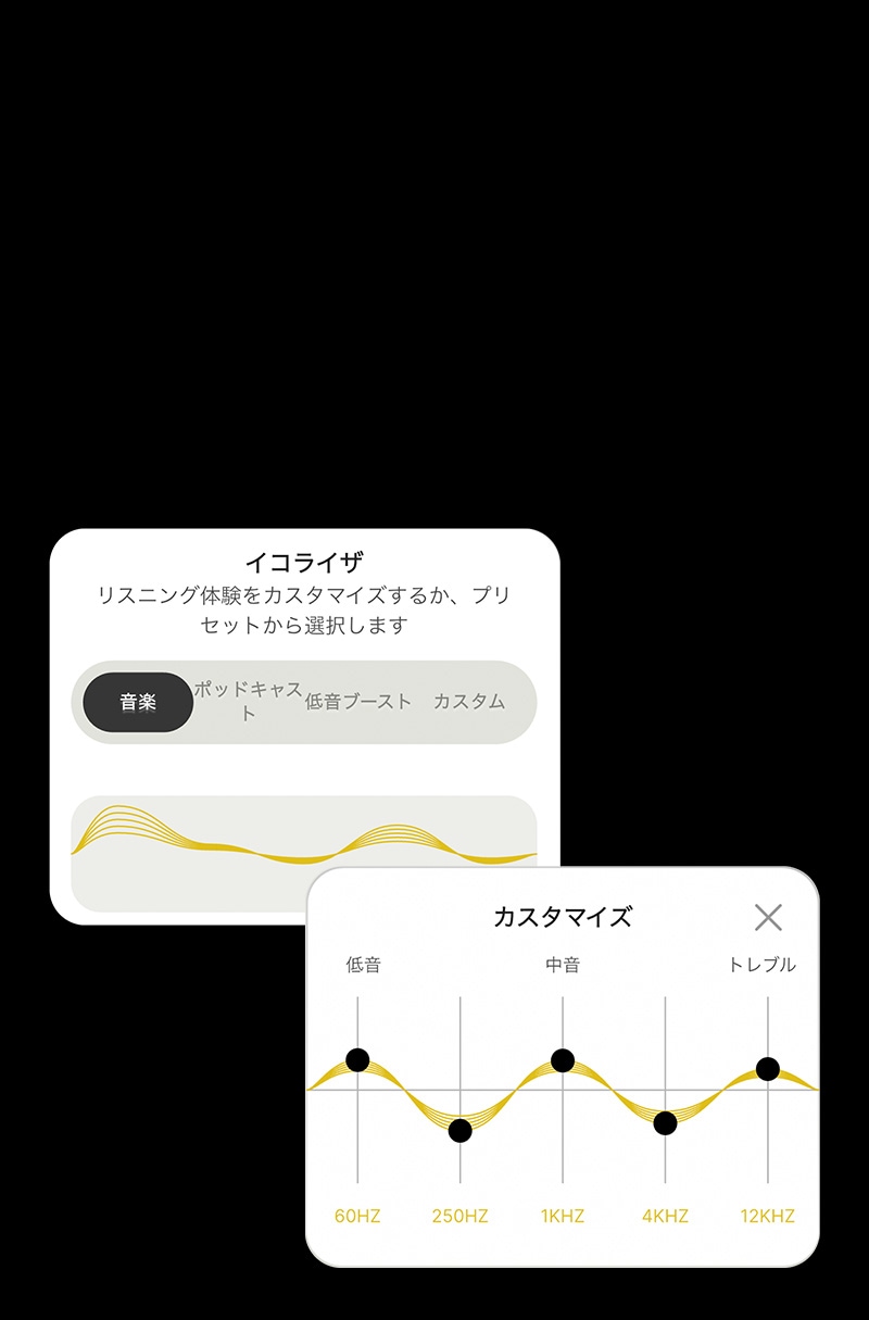 Skullcandyアプリから3つの標準イコライザとカスタム設定が可能です。音楽鑑賞に最適な『音楽モード』迫力サウンドの『低音ブーストモード』低音を抑え声が聞きやすい『ポットキャストモード』。さらに『カスタムイコライザモード』では5つのバンドから自分好みに調節しサウンドをパーソナライズし楽しむことができます。