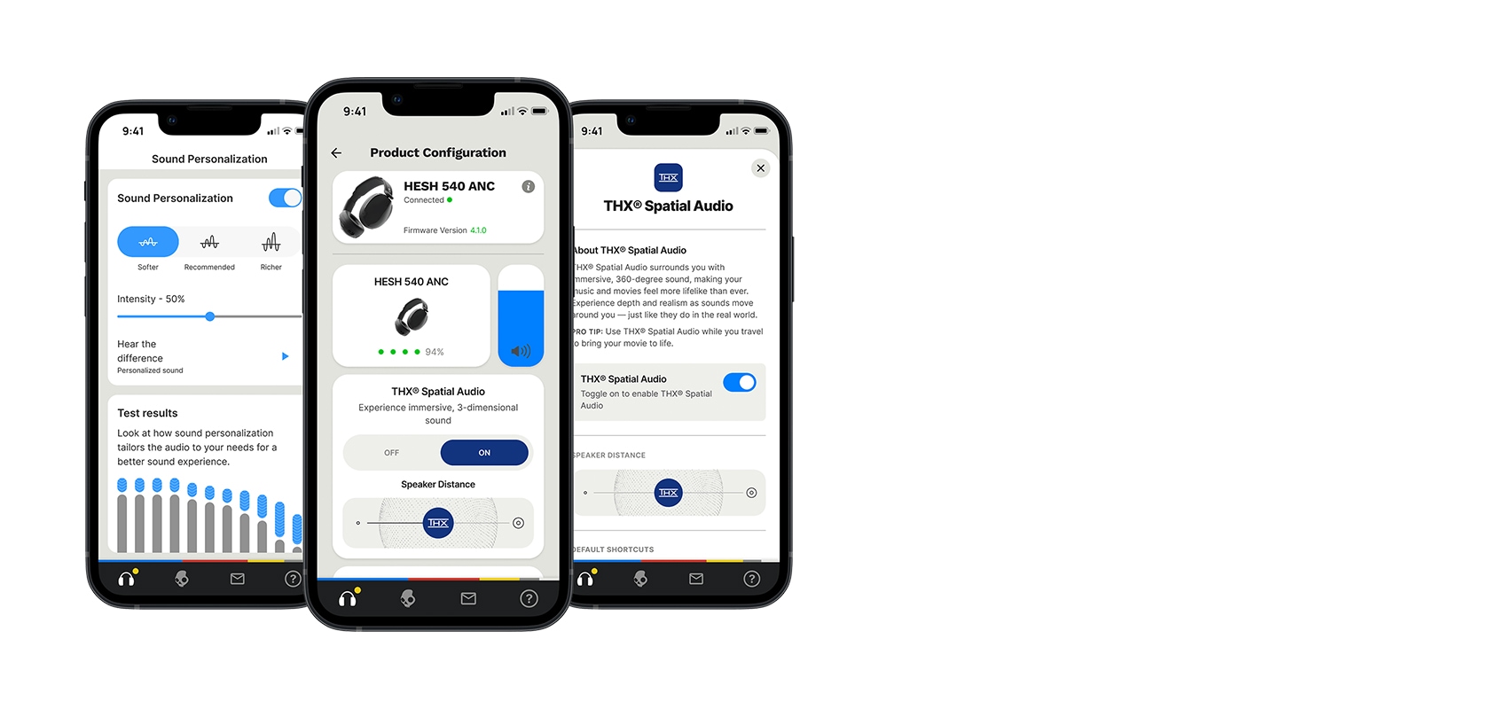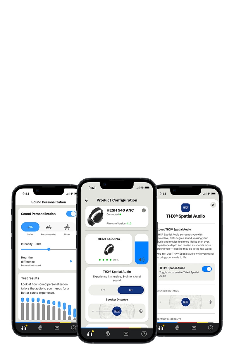 THXの調整、パーソナルサウンドの設定、EQ設定、ボタンカスタマイズ、アクティブノイズキャンセリングの調整、外音取り込みの調整など、快適なサウンド体験が簡単操作で実現できます。さらにSkullcandyアプリを介してのファームウェアのアップデートも可能で、新たな機能やバージョンが追加されていく未来対応のヘッドホンです。