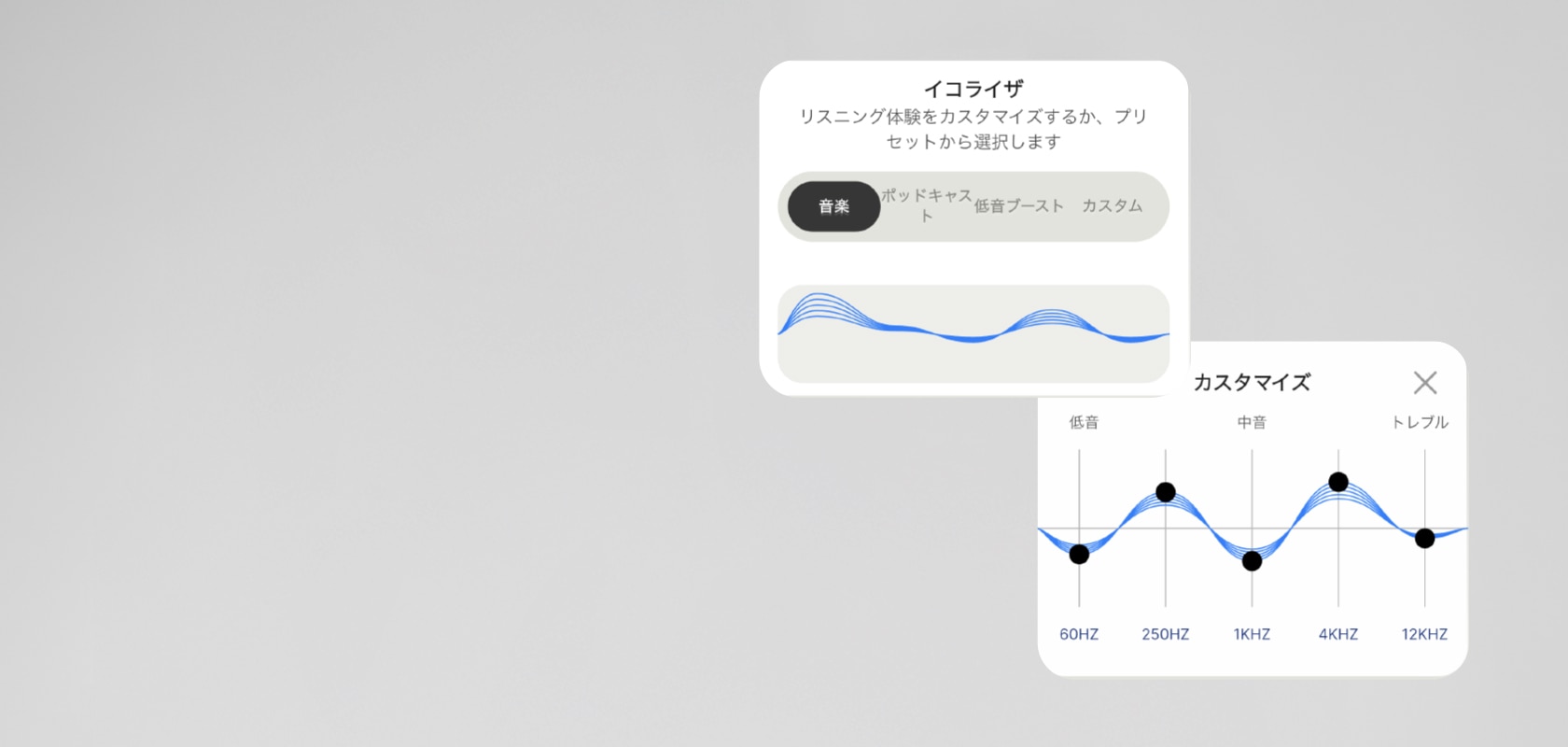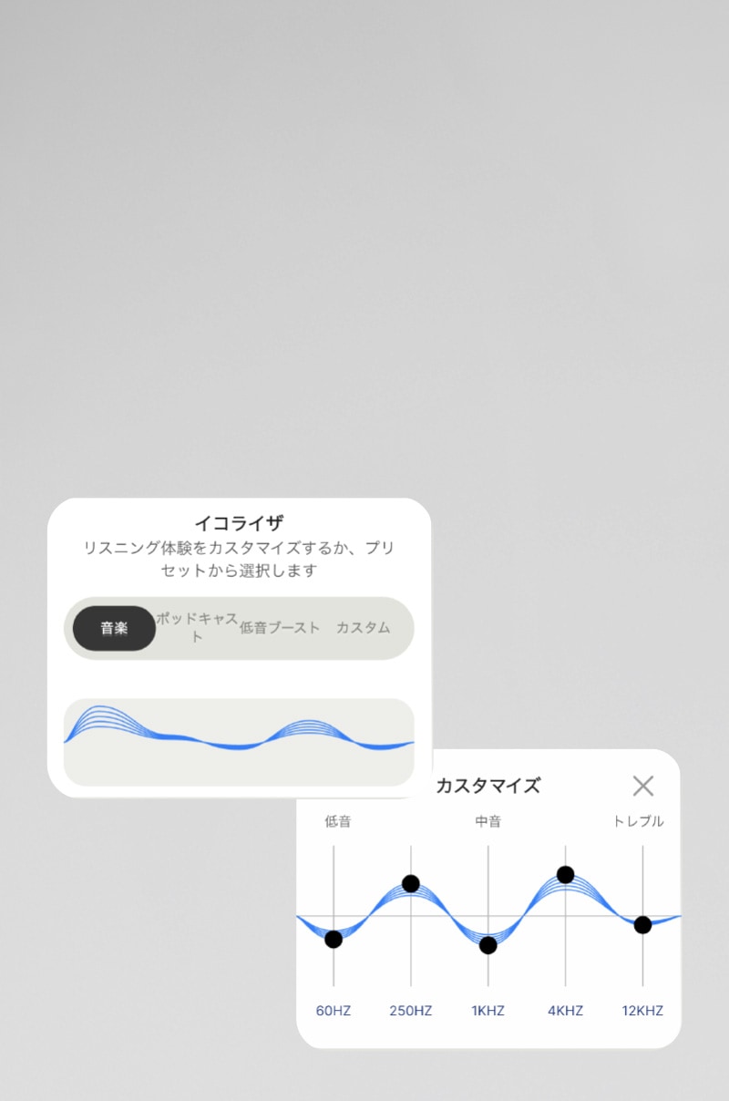 あなた専用の理想的なサウンドへ補正します。専用アプリ内のパーソナルサウンドにてあなたの聴力を測定し、あなた専用の音質へと改善することで聞き取りづらかった音が聞こえるようになり新次元の音楽体験を味わえます。アプリ内での測定結果に基づきサウンドプロファイルが作成されヘッドホンへ直接保存されます。